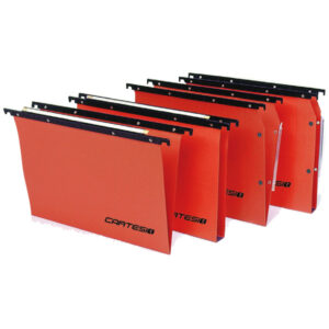 La cartella sospesa Cartesio è realizzata in cartoncino kraft arancio da 240 g/mq con aste di sospensione antiurto. Ha un fondo a V, occhielli metallici e portaetichette lenticolare, adatta per cassetti con interasse 39 cm.