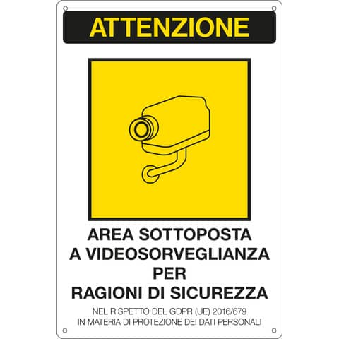 Il cartello segnalatore indica che l”area è sottoposta a videosorveglianza con registrazione, conforme al regolamento UE 2016/679. Realizzato in alluminio, è resistente ai solventi e alle intemperie, adatto per ambienti interni ed esterni.