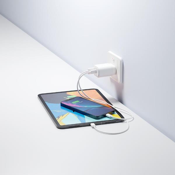 Caricatore da muro 20W USB-C PD con doppia porta per ricaricare due dispositivi contemporaneamente. Offre la massima velocità di ricarica per iPhone serie 12 e altri dispositivi compatibili, ripristinando il 50% della durata della batteria in soli 30 minuti.
