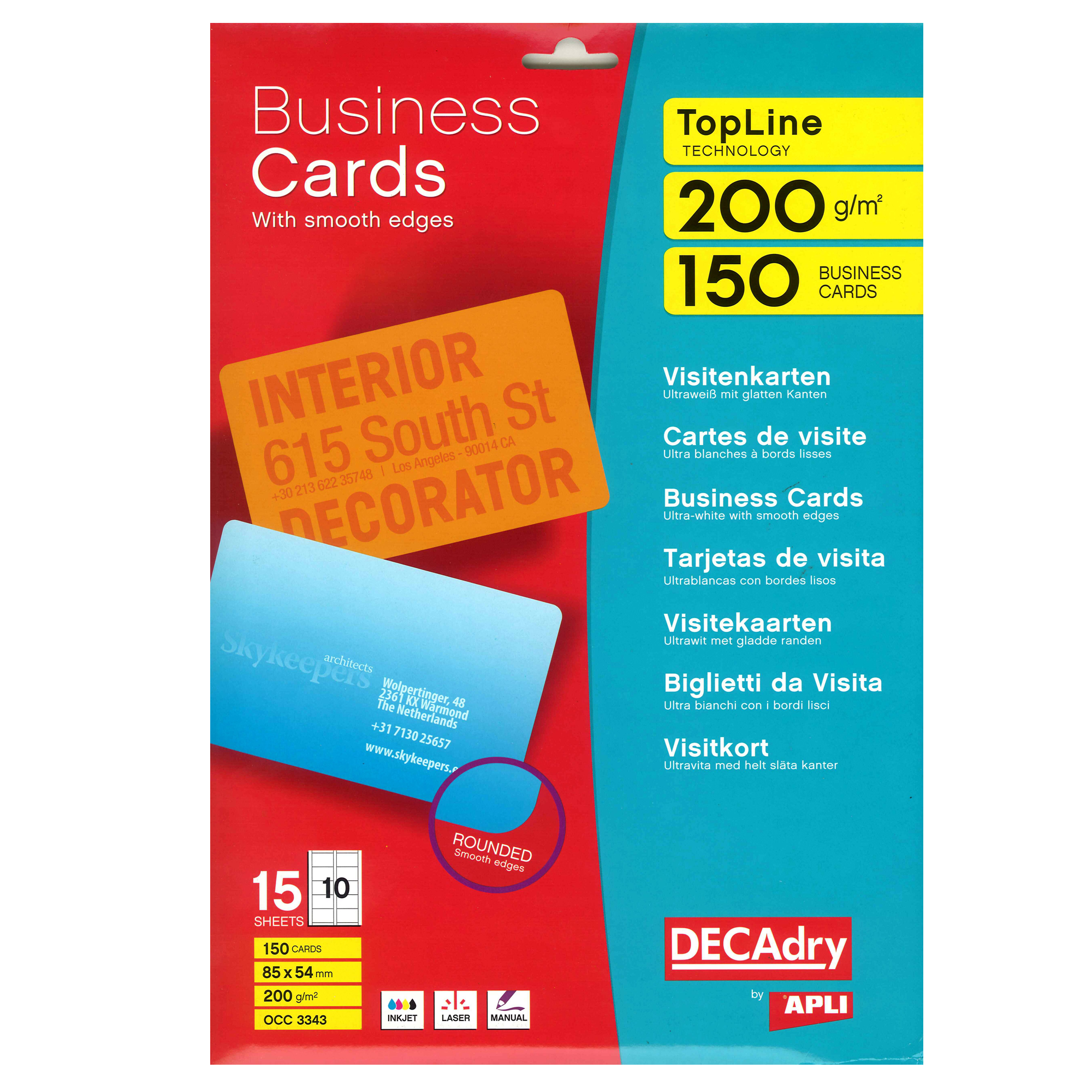 Biglietti da visita in carta speciale per stampanti, dimensioni 85 x 54 mm, peso 200 gr, angoli squadrati, bordo liscio, colore biano, marca Decadry, confezione da 15 fogli di 10 biglietti.