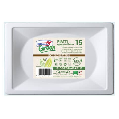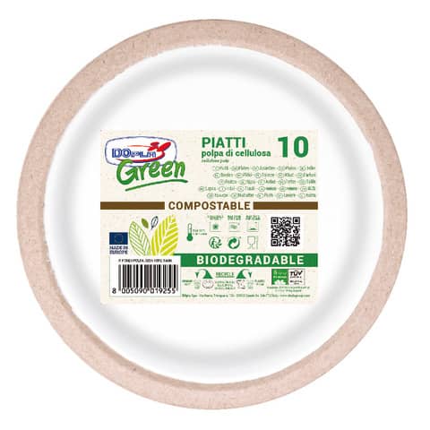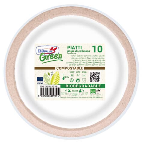 Prodotto Dopla Green, piatti piani in fibra vergine di diametro 230 mm, colore bianco. Adatti al contatto con alimenti fino a 70 °C per 15 minuti, conferme alle norme CE e legislazione italiana. Confezione da 20 pezzi.