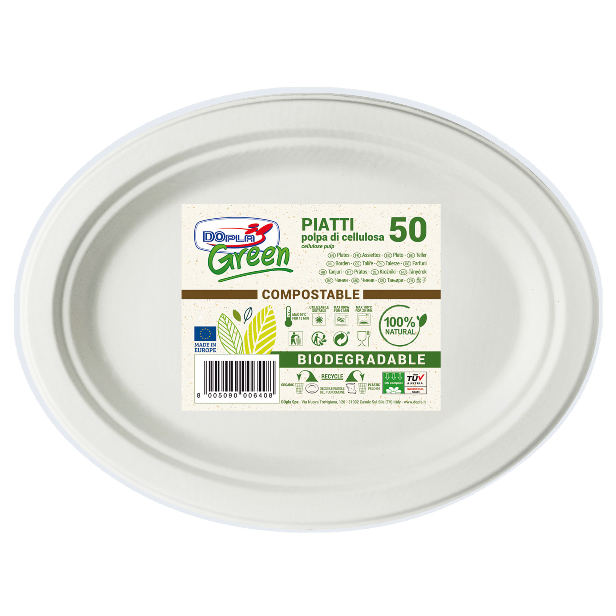 Scopri i piatti ovali biodegradabili Dopla Green, ideali per il catering. Realizzati in polpa di cellulosa, sono adatti per alimenti a temperature controllate e possono essere utilizzati anche in forno o microonde.
