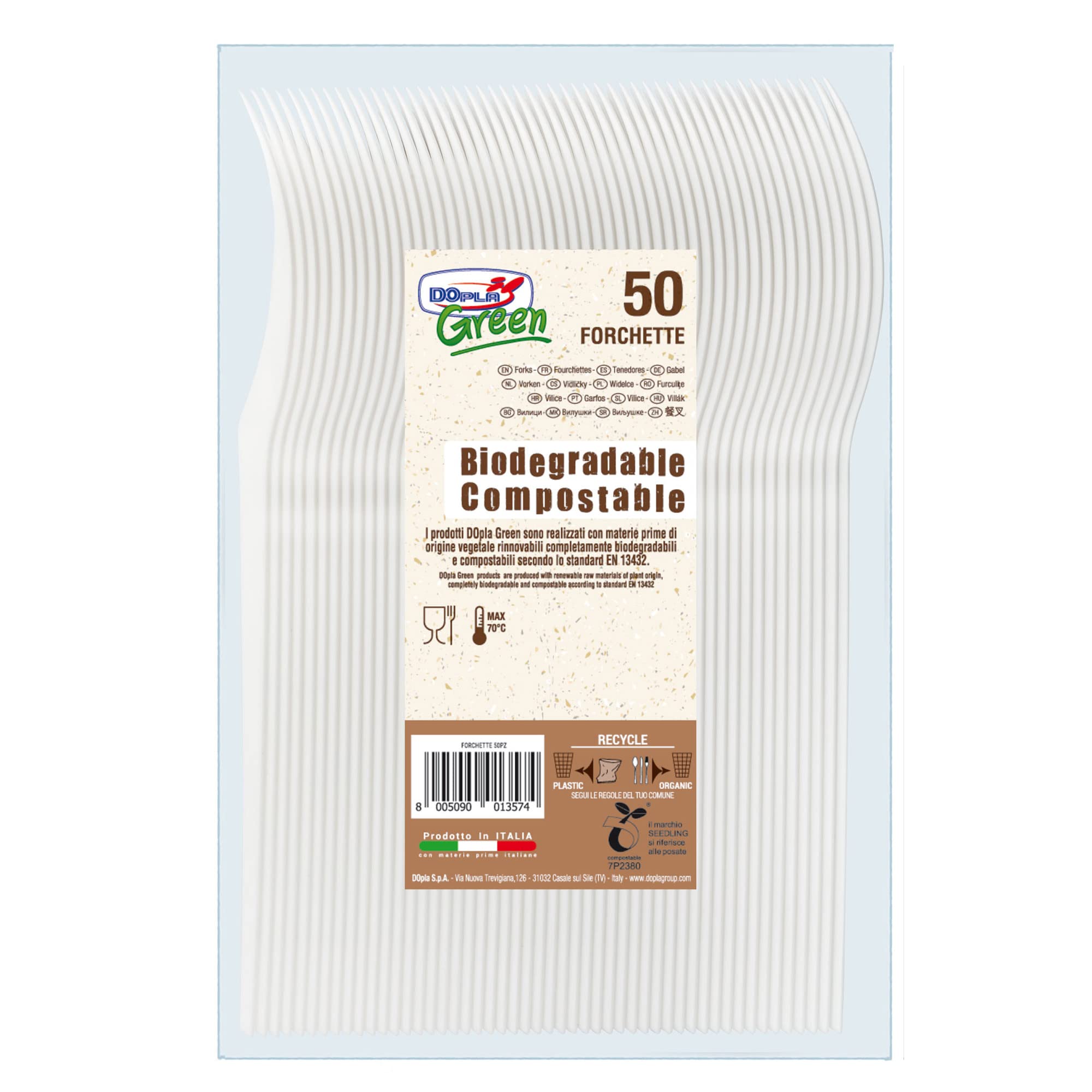 Il prodotto Cucchiai in Estabio di colore avorio è compostabile e biodegradabile, conforme alla norma EN 13432, adatto per alimenti fino a 70°C, ideale per il catering.