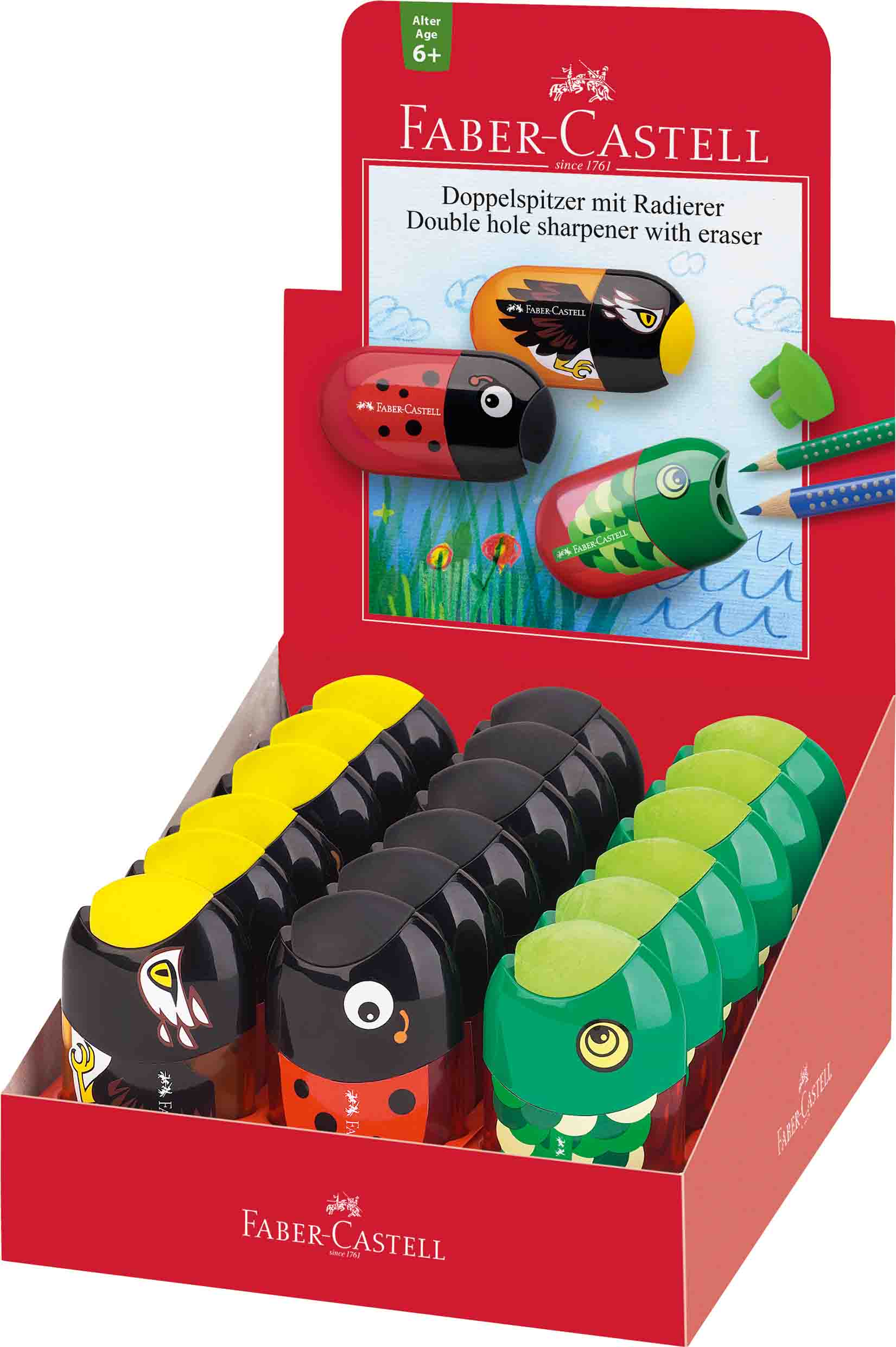 Il Temperamatite Animals di Faber Castell è un pratico portamine a 2 fori per matite standard e matite Jumbo, dotato di gomma incorporata, contenente 18 temperini con soggetti animali assortiti come pesce, coccinella e aquila.
