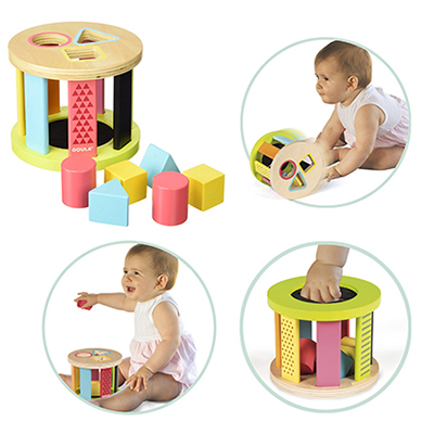 Gioco ad incastro forme geometriche include 6 pezzi geometrici di 3 forme diverse che il bambino introduce nelle aperture corrispondenti il tamburo ha una base di feltro per poter tirare fuori i pezzi facilmente
