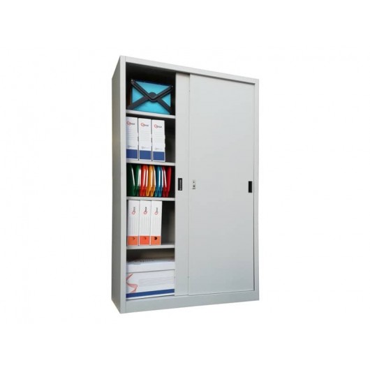 Acquista l”armadio basso metallico KUBO con ante scorrevoli, 2 vani e 2 ripiani, ideale per l”archiviazione in ufficio. Realizzato in lamiera d”acciaio con verniciatura epossidica colore grigio, dotato di serratura di sicurezza e maniglie ad incasso.