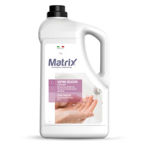Il Sapone liquido Matrix è un prodotto per la pulizia quotidiana delle mani, con formula a pH neutro che rispetta la pelle e garantisce l”igiene, disponibile in confezioni da 5 L.