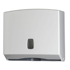 Il distributore asciugamani Basica è una struttura in ABS con base grigia e cover bianca, adatto per asciugamani piegati. Dispone di finestra per il controllo del livello della carta e serratura in plastica. Le sue dimensioni sono 25×9,2×22 cm.