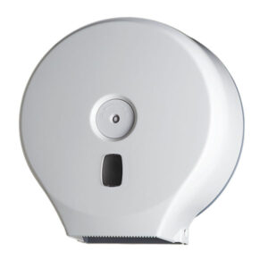 Il Distributore di carta igienica in ABS bianco è progettato per rotoli Minijumbo, misura 28,2x12x29,4 cm e ha una capacità di 25,5 cm, richiede pulizia periodica con panno morbido.