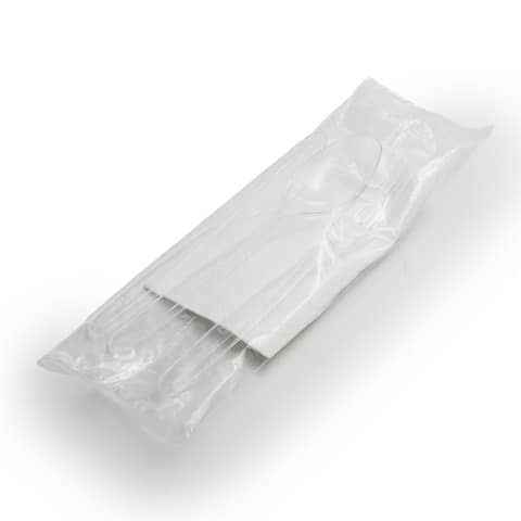 Set coltello, forchetta e cucchiaio con tovagliolo, materiale PS-Polistirolo, idoneo al contatto con gli alimenti, anche acidi e grassi, a temperatura ambiente o inferiore.