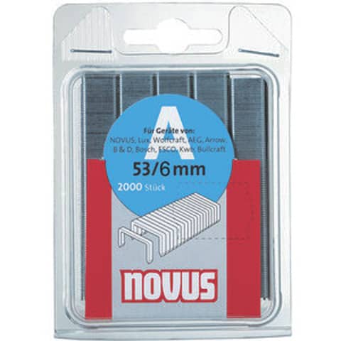 Punti tipo A 53/8 mm per fissatrici Novus J13, J17, J27. Ideali per stoffa, cartoncino e carta, con dimensioni 8 mm di altezza, 11,3 mm di larghezza e 0,75 mm di profondità. Confezione da 2000 pezzi.