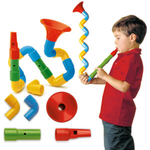 Il Saxoflaute è un gioco creativo per bambini che consente di costruire strutture tridimensionali e strumenti musicali con tubi colorati, favorendo la fantasia e la creatività in totale sicurezza grazie ai pezzi infrangibili.