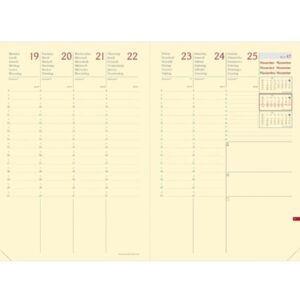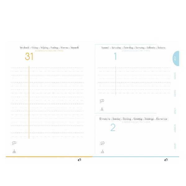 Agenda giornaliera 2023 con impaginazione di 1 giorno per pagina e sezione per appunti. Copertina rigida, carta avorio Clairefontaine, tasca portaoggetti interna e rilegatura cucita ultra resistente.