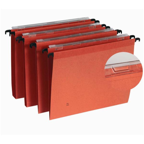 Le cartelle sospese CF25SIGNALETIC CART SOSP 39/V sono realizzate in robusto cartoncino kraft arancione e dotate di ganci in plastica per un facile scorrimento sui binari e barrette di sospensione in polistirene nero antiurto, ideali per l”organizzazione dei documenti.
