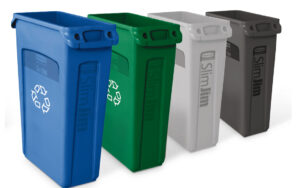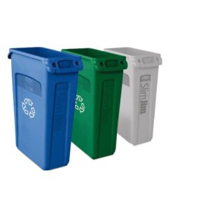 Il contenitore rifiuti Rubbermaid Slim Jim con canali di ventilazione da 87 L è ideale per la differenziata, progettato per ridurre lo sforzo muscolare e i costi di manodopera, disponibile in verde.