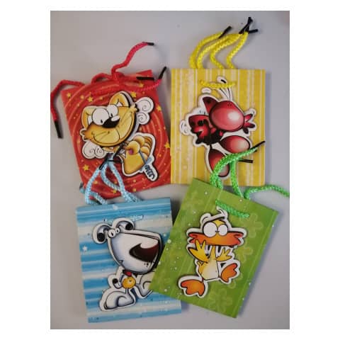 Il Shopper Saemec Clown è disponibile in 4 soggetti assortiti, con dimensioni di 19 x 9 x 25 cm e confezionato in scatole da 12 pezzi, perfetto per carta regalo e sacchetti regalo.
