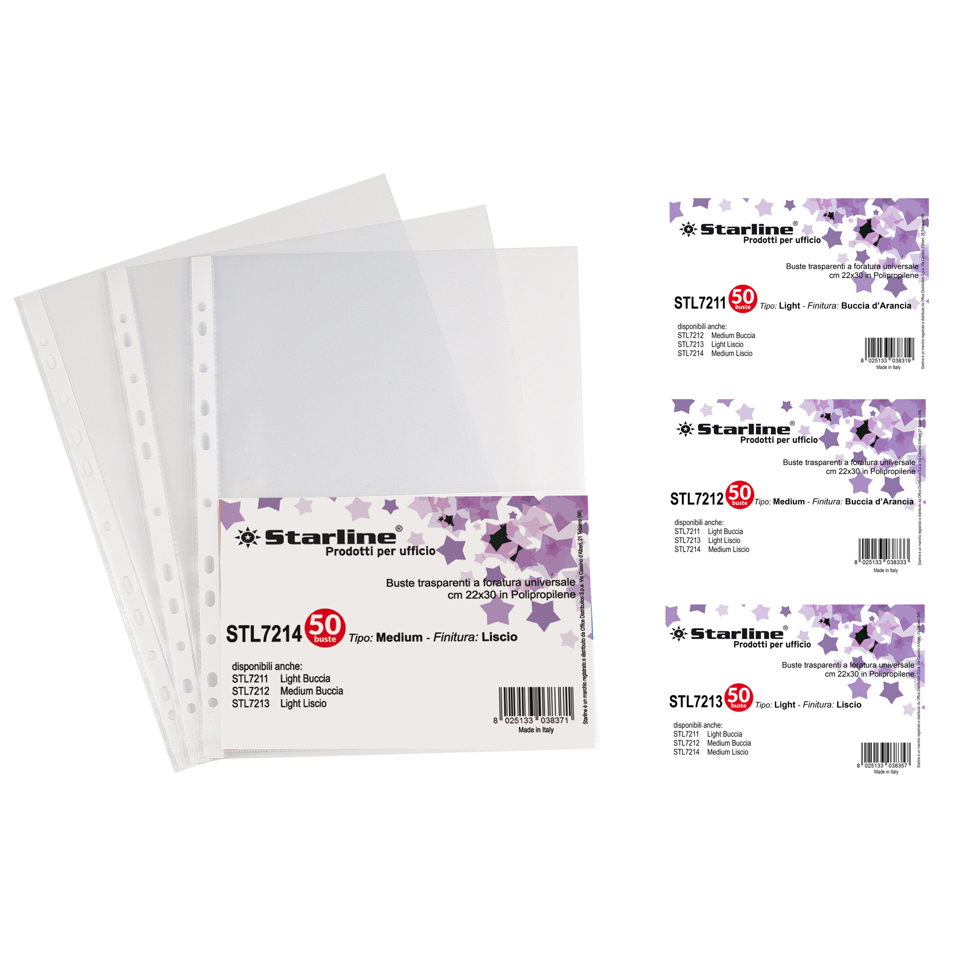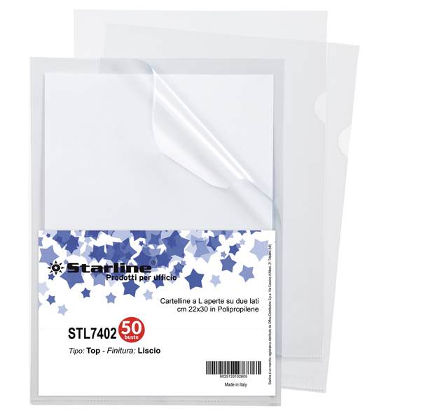 Le buste trasparenti Starline sono realizzate in polipropilene con finitura liscia e foratura universale rinforzata, disponibili in confezioni da 50 pezzi, formato utile 22×30 cm, ideali per varie applicazioni.