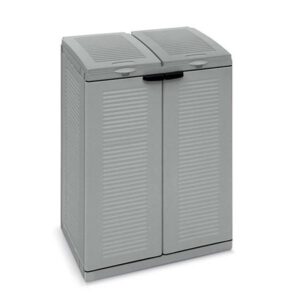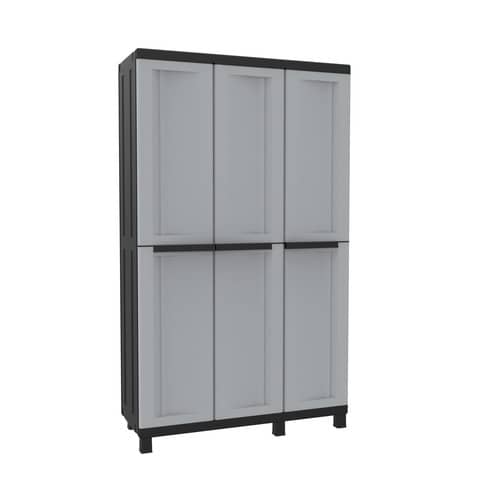 Il mobile per ufficio Armadio Transforming Modular 3 è un armadio grigio con struttura modulare interconnessa e sovrapposta, ideale per interni ed esterni, resistente alle intemperie e ai raggi UV, dotato di ripiani modulari regolabili.