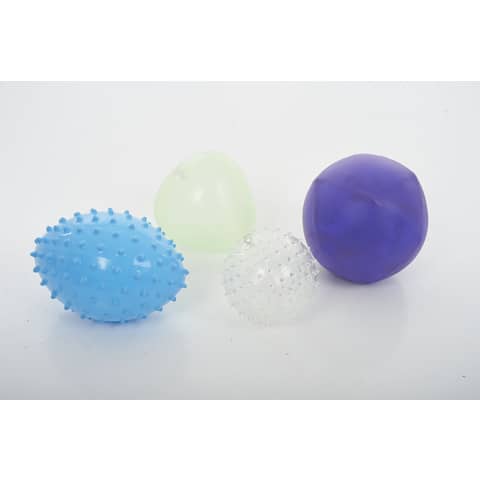 Il set Commotion TickiT D include quattro palle luminose in gomma che si illuminano al rimbalzo, con superficie a bolle per stimolare il tatto e facilitare la presa. Il diametro di ogni palla è di 10 cm e sono disponibili in colori assortiti.