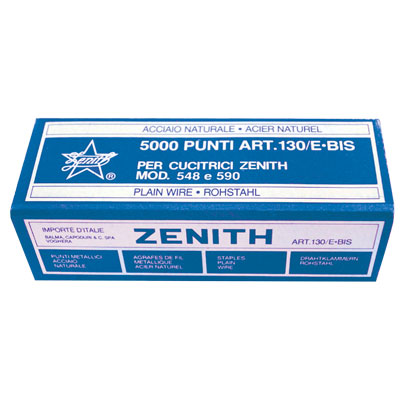 Acquista i punti cucitrici Zenith 130E, in acciaio naturale, con gambine lunghe 4mm. Ogni confezione contiene 1000 punti. I punti metallici Zenith si distinguono per la loro alta qualità e facilità di uso, garantendo una migliore penetrazione nei tessuti.