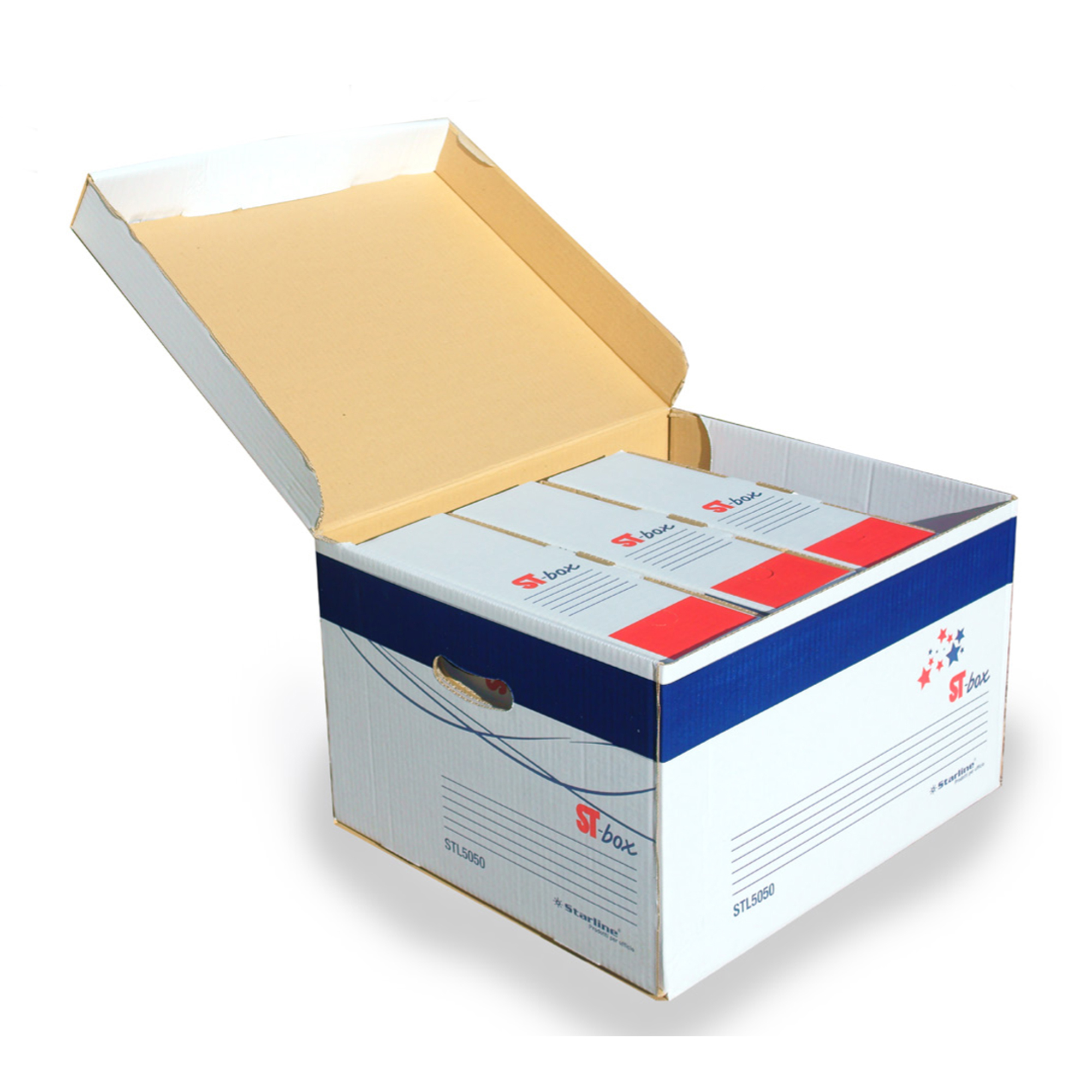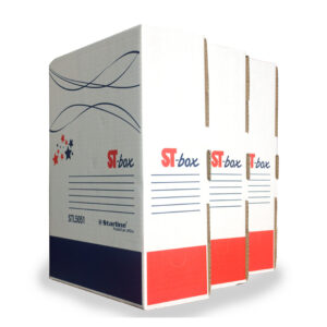 La scatola archivio ST-box è in cartone riciclato, con chiusura lembo ribaltabile e dimensioni 24,5×32,5×10 cm. Ideale per Scatole archivio in formato A4.