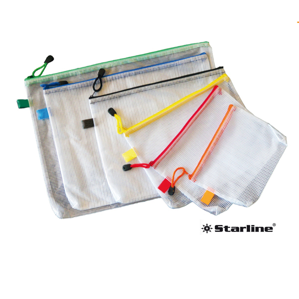 La busta trasparente STARLINE in PVC liscio offre alta capacità di contenuto con soffietti laterali e patella per chiusura, ideale per oggetti spessi fino a 25 mm, misura 21×30 cm.