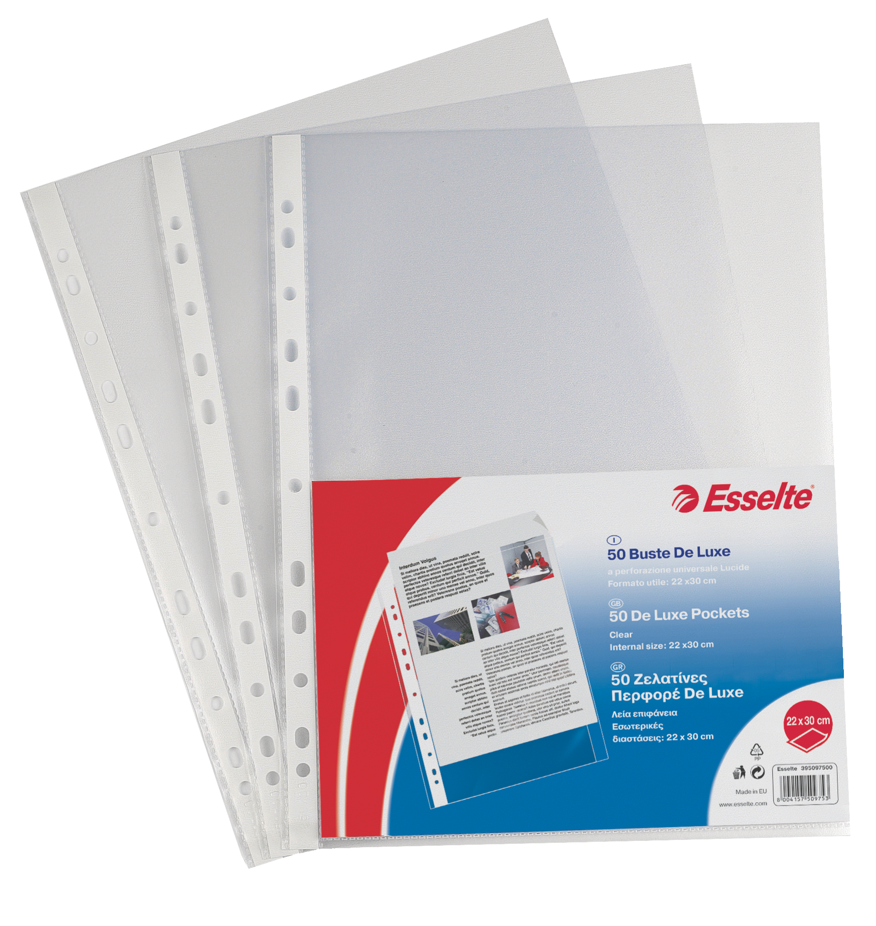 Buste a perforazione universale Esselte DELUXE di alta qualità, formato A4, in PP antiriflesso e trasparente, con finitura goffrata e banda di rinforzo bianca, ideali per proteggere documenti, confezione da 50.
