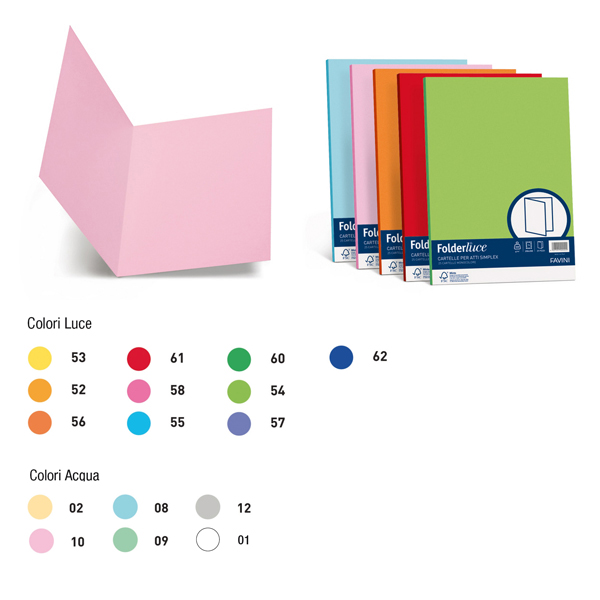 Le cartelle in cartone sono prodotte con robusto cartoncino bristol da 200 grammi e misurano 25×34,5 cm. Sono disponibili in confezioni da 25 pezzi con 5 colori brillanti: rosso, azzurro, verde, giallo e arancio.