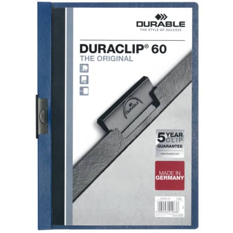 La cartellina con clip DURACLIP è un prodotto originale di DURABLE, realizzato in PVC di alta qualità e progettato per presentare e archiviare documenti in modo professionale, con una capacità di 1-60 fogli formato A4 e un dorso di 6 mm, garantito per 5 anni.