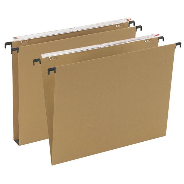 Le cartelle sospese in cartoncino kraft sono realizzate per un facile scorrimento con ganci in plastica e barrette di sospensione in polistirene nero, ideali per Cartelle Sospese in cartoncino.