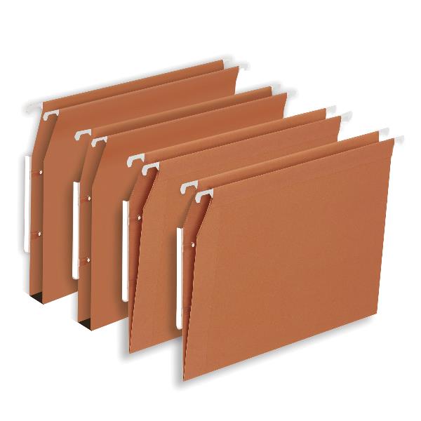 Cartelle sospese in cartoncino robusto, lettura superiore, ideali per cassetti. Realizzate con materiali di alta qualità, come cartoncino orange kraft, e dotate di ganci in nylon e astina in acciaio. Sono inoltre fornite di portacartellino Scope già montato e fondo a V per un”organizzazione efficiente degli spazi.