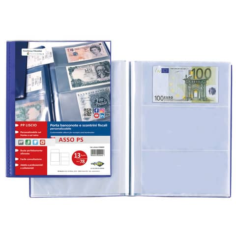 Il Porta banconote e scontrini fiscali Sei Rota ASSO PS 13 è un prodotto utile per organizzare fino a 156 scontrini fiscali o 78 banconote. Ha un formato esterno di 240×305 mm e contiene 13 buste con 6 tasche ciascuna. La variante disponibile è di colore blu.