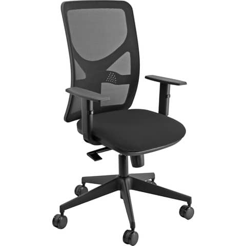 La sedia operativa St. Louis è una sedia ufficio ergonomica con braccioli, schienale in rete e rivestimento in tessuto nero. Dispone di un sistema di elevazione a gas e meccanismo oscillante bloccabile, ideale per un uso quotidiano confortevole.