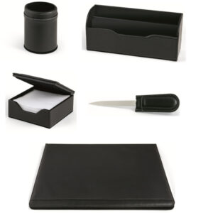 Acquista il nostro set da scrivania composto da 5 pezzi in similpelle marrone, ideale per organizzare la tua postazione di lavoro con stile e funzionalità, includendo un pratico sottomano, portanotes, base portastilofori, bicchiere per penne e tagliacarte.