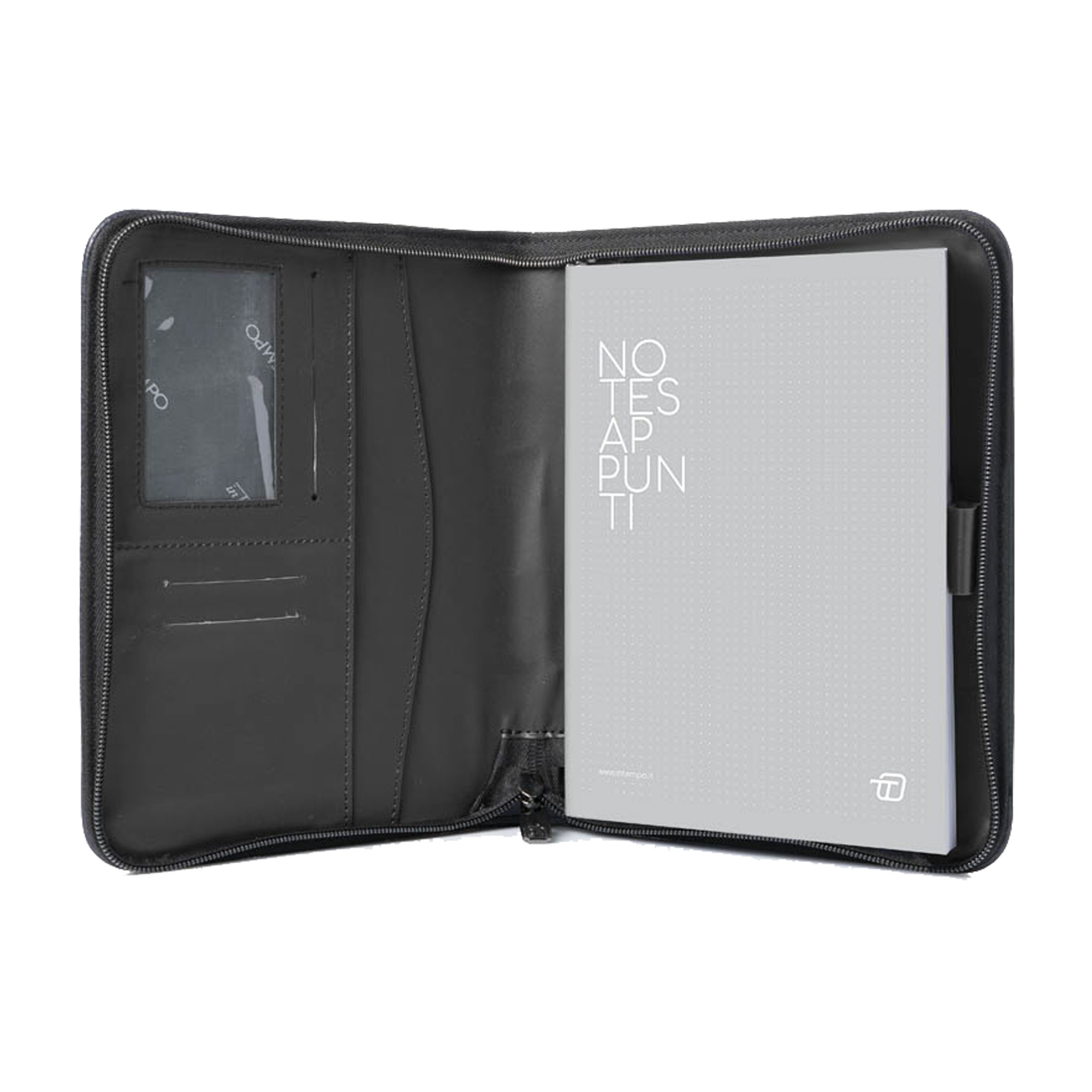 Il Portablocco Gate Trended è un pratico portablocco A4 in ecopelle nera, ideale per organizzare appunti e documenti, dotato di tasca interna a soffietto, notes verticale A4 e tasca esterna con zip.