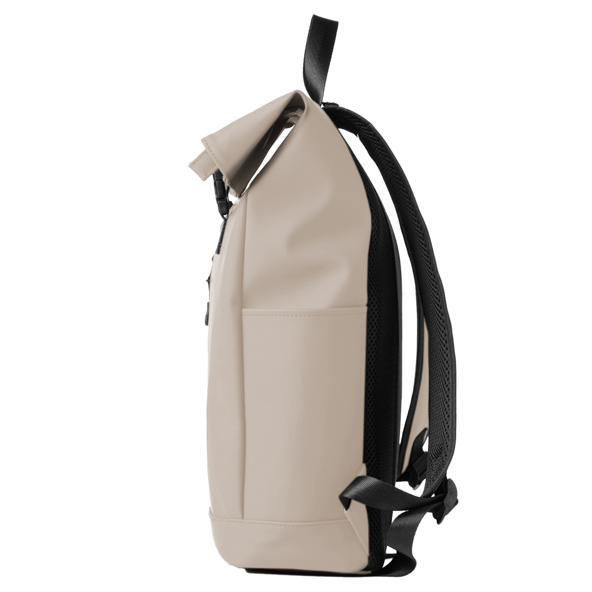 Il zaino Roll-top Drop è realizzato con materiale gomma resistente all”acqua, ideale per proteggere oggetti personali. Ha un grande vano centrale e tasche laterali, con chiusura superiore a roll-top e moschettone, disponibile nel colore crema.