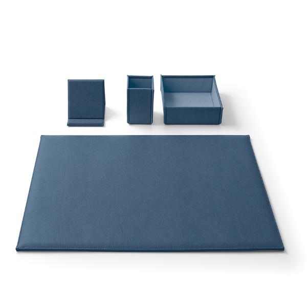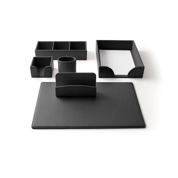 Il Set da scrivania classico Munari in similpelle bruciato è composto da 6 pezzi: sottomano doppio, base sparticarte, base con 2 boccalini, barattolo per penne, tagliacarte e blocco appunti A5, tutti realizzati in similpelle di alta qualità.