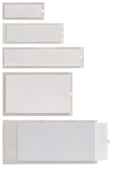 Portaetichette adesive in PVC trasparente, facili da applicare. Formato 6,5×10 cm, confezione risparmio da 100 pezzi. Ideali per etichettare cassetti, ripiani e oggetti vari in modo trasparente.