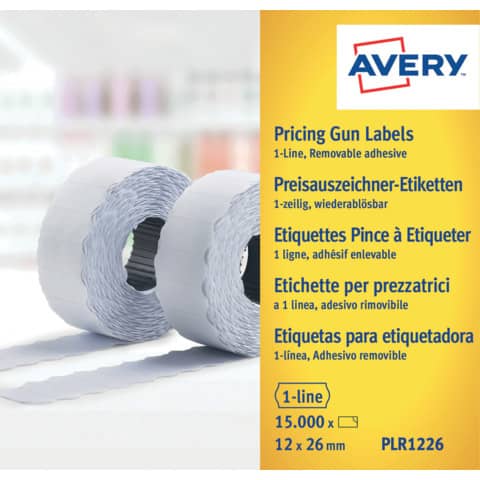 Le etichette permanenti per prezzatrici Avery sono caratterizzate da pre-tagli di sicurezza e sono disponibili in diverse versioni. Il prodotto PLP1226 è una confezione da 10 rotoli di etichette bianche in carta, misura 12×26 mm, adatte per prezzatrici a 1 linea come PL1/8 e PL2/18.
