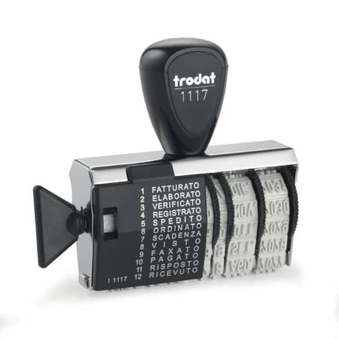 Il datario polinome TRODAT CLASSIC 1117 in gomma è un prodotto della categoria Datari, numeratori e polinomi, con altezza caratteri di 4 mm e 12 diciture personalizzate, tra cui FATTURATO, ELABORATO e REGISTRATO.