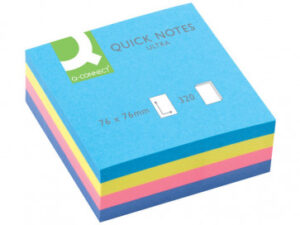 Foglietti riposizionabili Q-Connect ideali per messaggi e note rapide, adatti per uso in casa o ufficio, aderiscono alla maggior parte delle superfici. Dimensioni: 76×76 mm, blocchetto da 320 fogli, colori assortiti ultra.