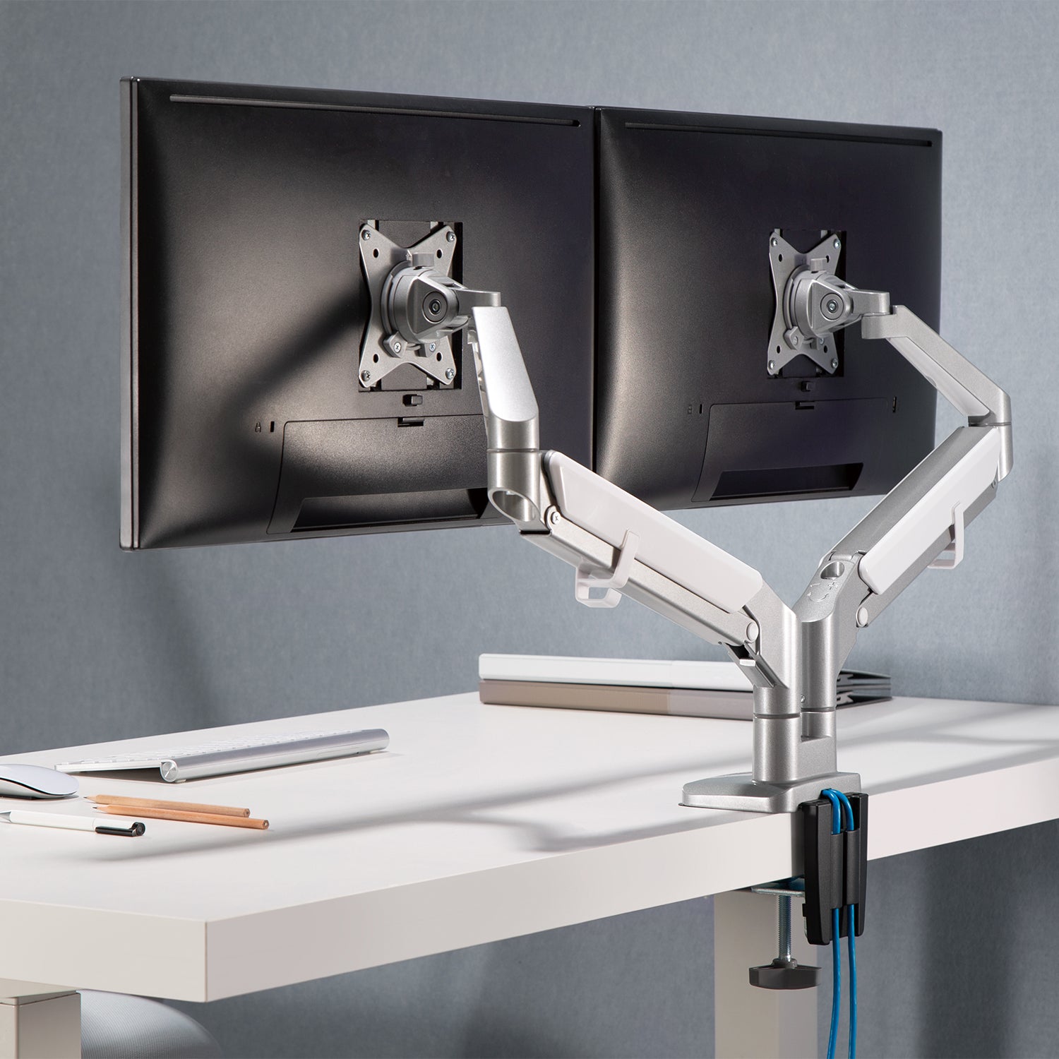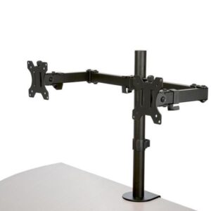 La staffa monitor doppia regolabile riduce l”ingombro sulla scrivania e aumenta il comfort. Il design a barre trasversali offre un ampio raggio di movimento e regolazione dell”inclinazione, orientamento e altezza.