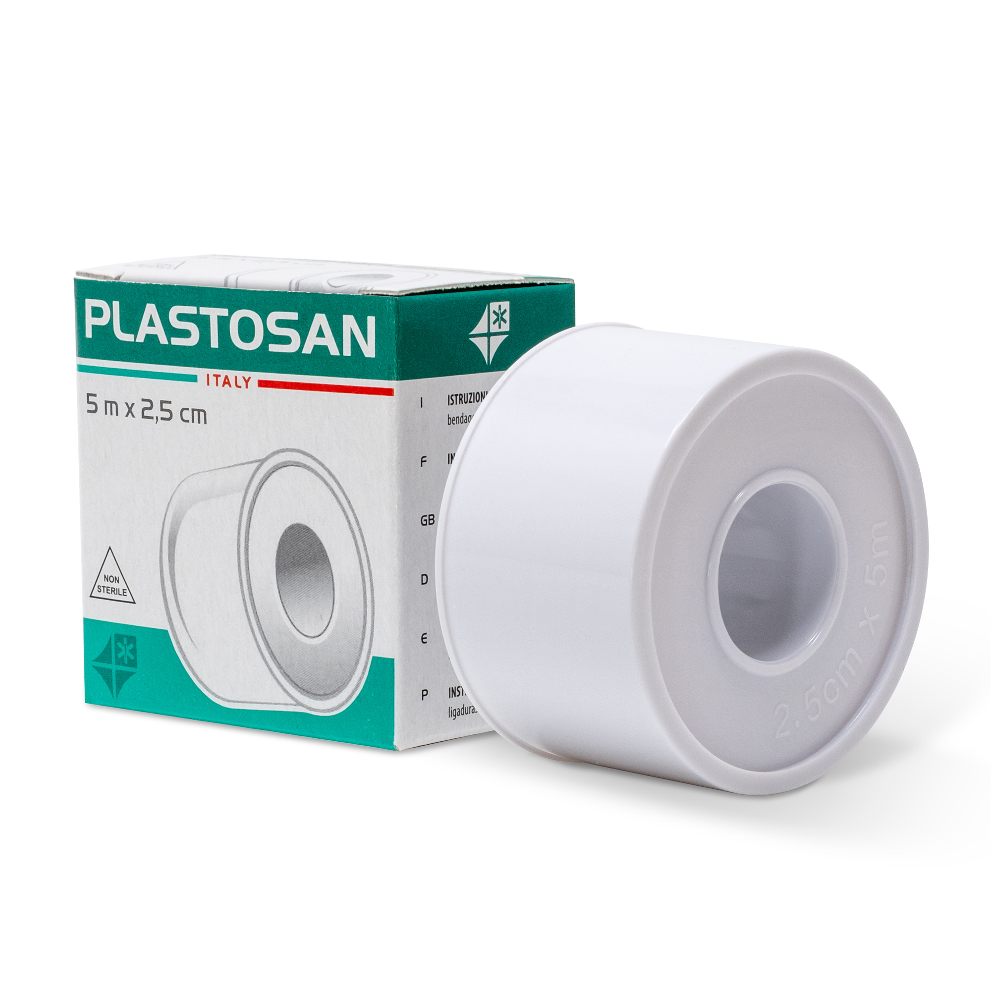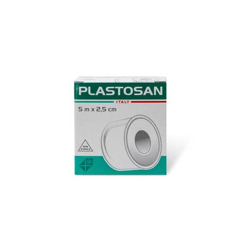 Il cerotto in TNT Plastosan è un prodotto di primo soccorso ipoallergenico per il fissaggio delle medicazioni, disponibile in rotolo da 5 m x 2,5 cm, colore bianco opaco.