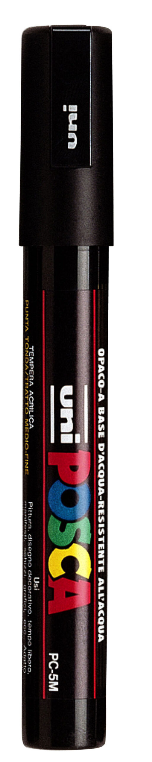 Il Marker Uni posca pc5m nero è un marcatore a tempera con inchiostro pigmentato a base d”acqua, resistente alla luce e all”acqua. Ha un alto potere coprente e colori intensi, miscelabili e acquerellabili, scrive su tutte le superfici come carta, cartoncini, plastica, vetro, metallo e tessuti con una punta tonda media di 2,5 mm.