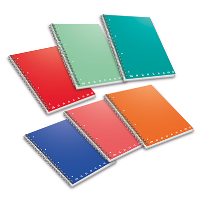 Quaderno spiralato A5 senza fori d”archivio, con spirale laterale, microperforatura e carta da 80gr/mq. Copertina patinata plastificata stampata in 1 colore, disponibile in colori assortiti, formato A5 con 60 fogli.