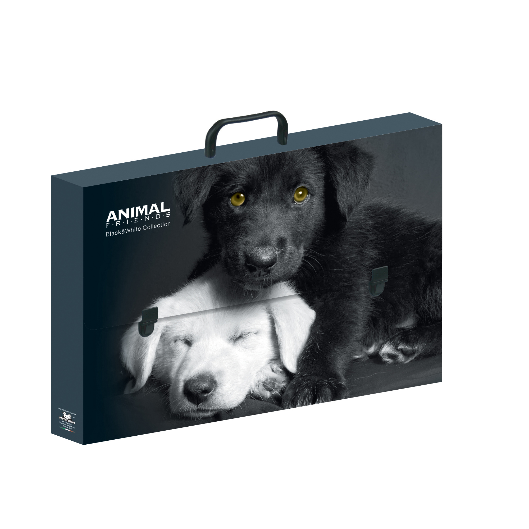 Valigetta polionda Animal Friends, dimensioni 28×38 cm con dorso 5 cm, ideale come raccoglitore o cartella, disponibile in fantasie assortite e dotata di clip di chiusura e maniglia per un pratico trasporto.