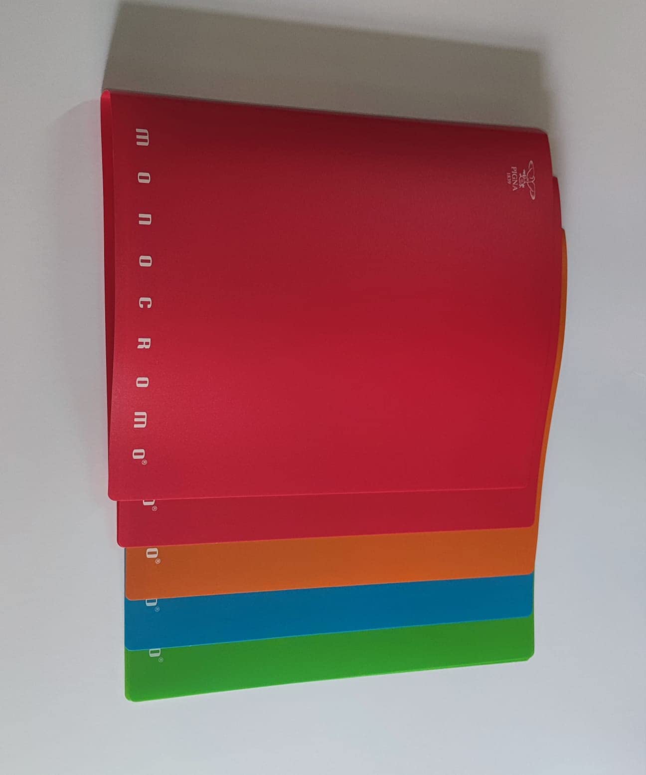 Il raccoglitore CF5QUAD è un quaderno ad anelli monocolore in formato A4 con carta 80 gr certificata PEFC, disponibile in 4 colori fluo assortiti e dotato di banda rinforzata trasparente.