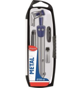 Il compasso studio 2 pezzi è un prodotto ideale per l”uso scolastico, adatto a scuole elementari e medie. Questo kit include un compasso asta snodata e punte di ricambio, con una pratica punta di sicurezza. I colori sono assortiti e il prodotto è interamente fabbricato in Italia.
