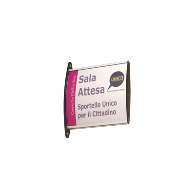Targa a bandiera cm 15×21 con doppio profilo bifacciale in alluminio estruso anodizzato naturale accoppiato protezione pvc antiriflesso tappo terminale ed attacco a muro ideale come targa segnaletica di identificazione informazione per interni di uffici enti pubblici edifici scuole e universit