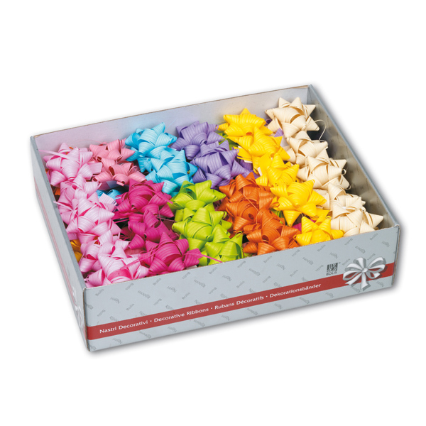 Scatola da 70 coccarde in carta sintetica altezza 19mm diametro 90mm 13 petali assortimento nei colori rosso turchese limone lavanda arancio menta magenta